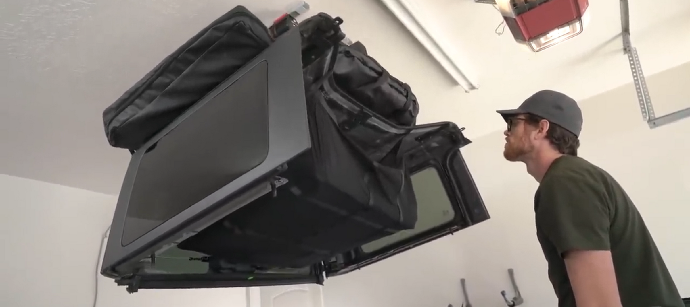 The Hard Top Lifter keeps your hard top safe by lifting from several points with a cargo net that wraps around both sides of your hard top. The cargo net fits under your hard top and is the perfect place to store the roof panels to keep them off the ground.