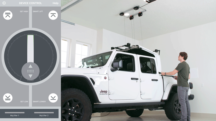 The MyLifter app’s “Smart Points" feature allows you to create raised and lowered limits for your hard top. A single button press on the app automatically moves the item to the selected limit.