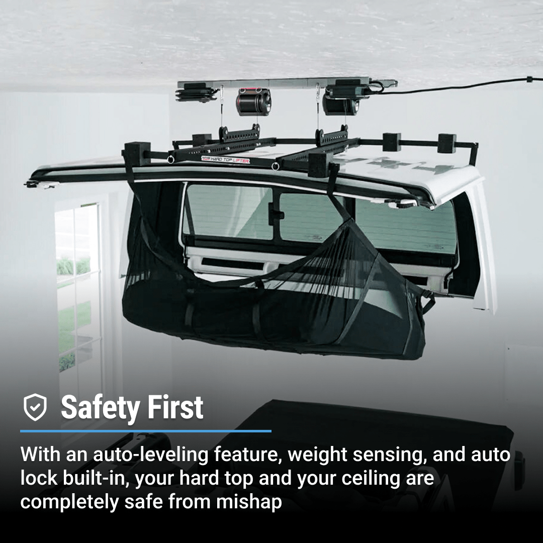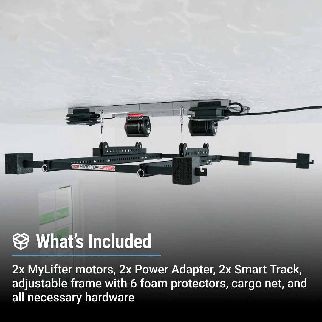 The MyLifter is the smartest and safest overhead storage motor. Period. With advanced features like weight sensing, overload protection, multi motor syncronization, Smart Stopping points, speed control, and a built in automatic lock, there really is nothing else like it. The Hard Top Lifter includes two MyLifter motors that work seamlessly together to hoist and store your hard top.