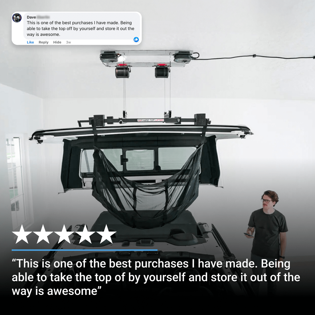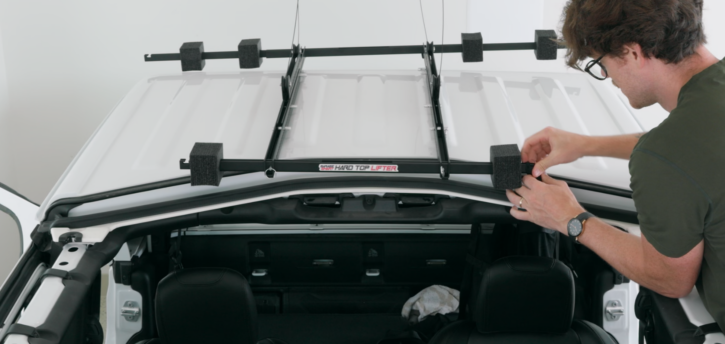 The Hard Top Lifter keeps your hard top safe by lifting from several points with a cargo net that wraps around both sides of your hard top. The cargo net fits under your hard top and is the perfect place to store the roof panels to keep them off the ground.
