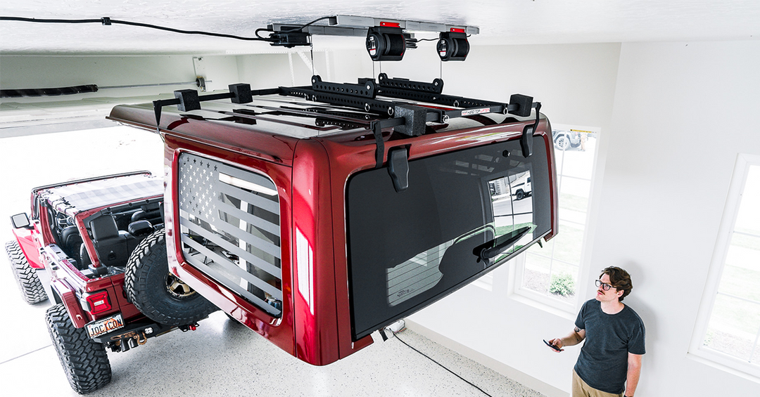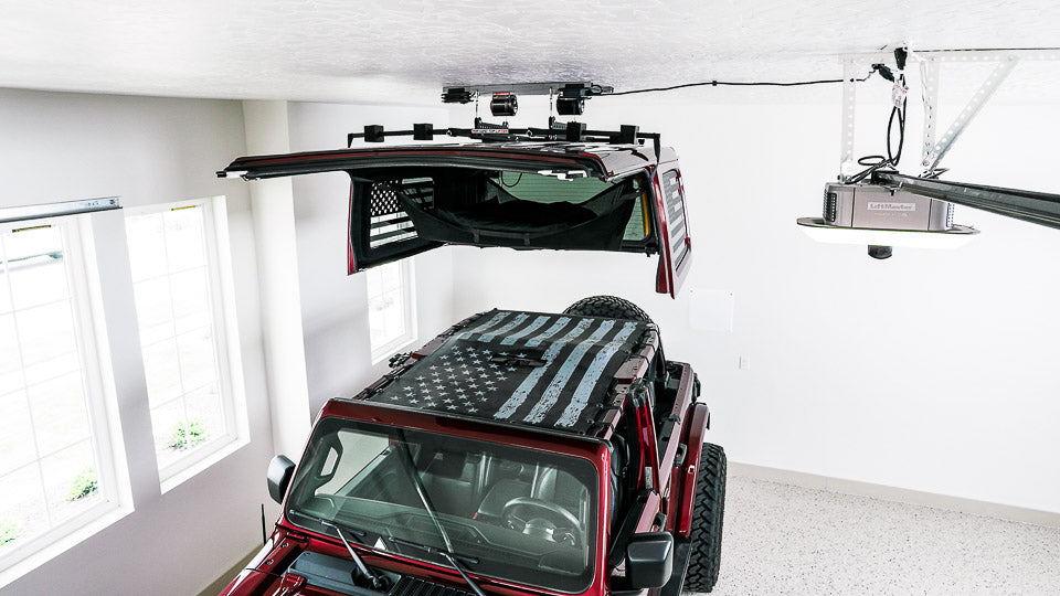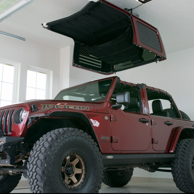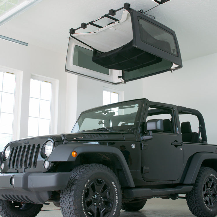 The Hard Top Lifter keeps your hard top safe by lifting from several points with a cargo net that wraps around both sides of your hard top. The cargo net fits under your hard top and is the perfect place to store the roof panels to keep them off the ground.