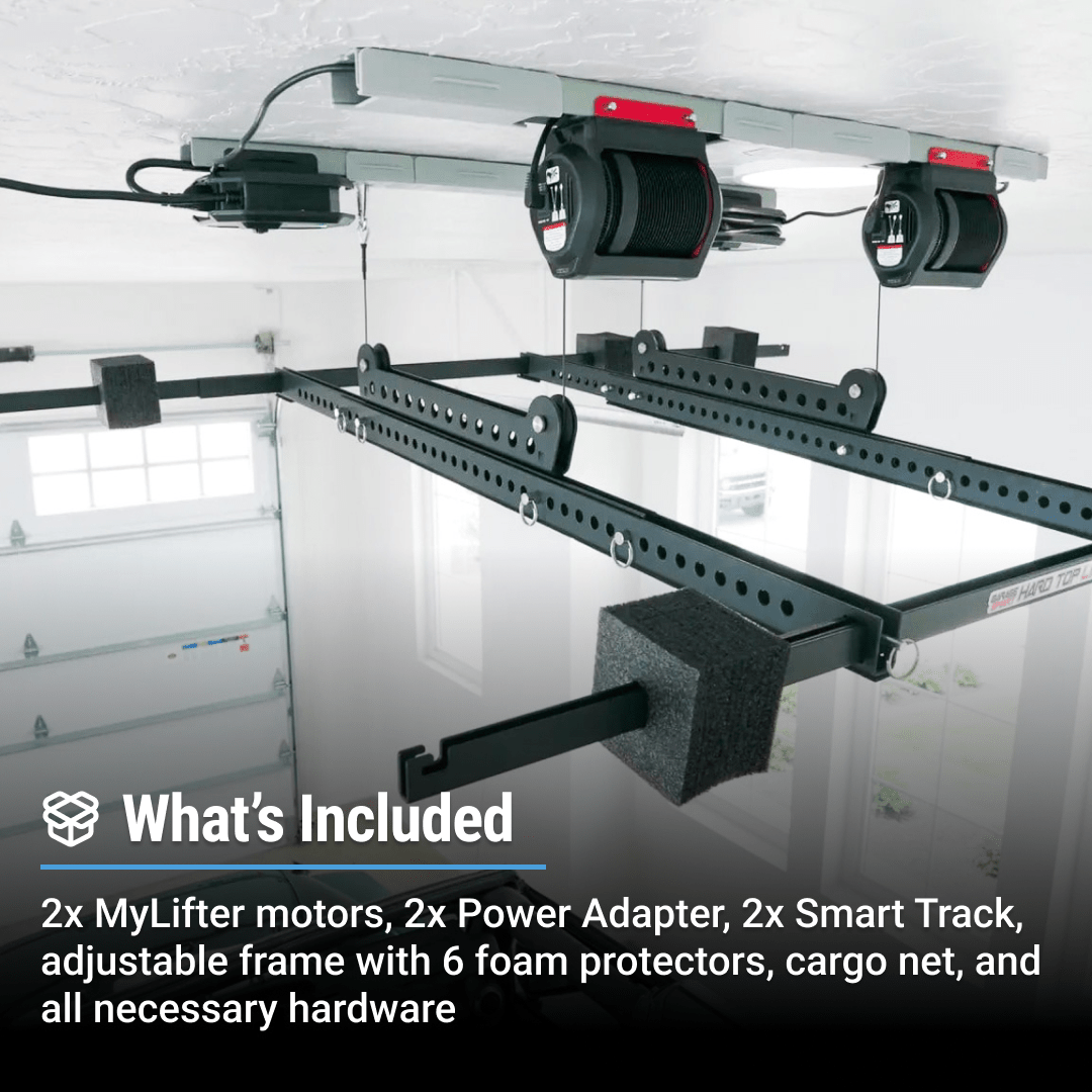 The MyLifter is the smartest and safest overhead storage motor. Period. With advanced features like weight sensing, overload protection, multi motor syncronization, Smart Stopping points, speed control, and a built in automatic lock, there really is nothing else like it. The Hard Top Lifter includes two MyLifter motors that work seamlessly together to hoist and store your hard top.