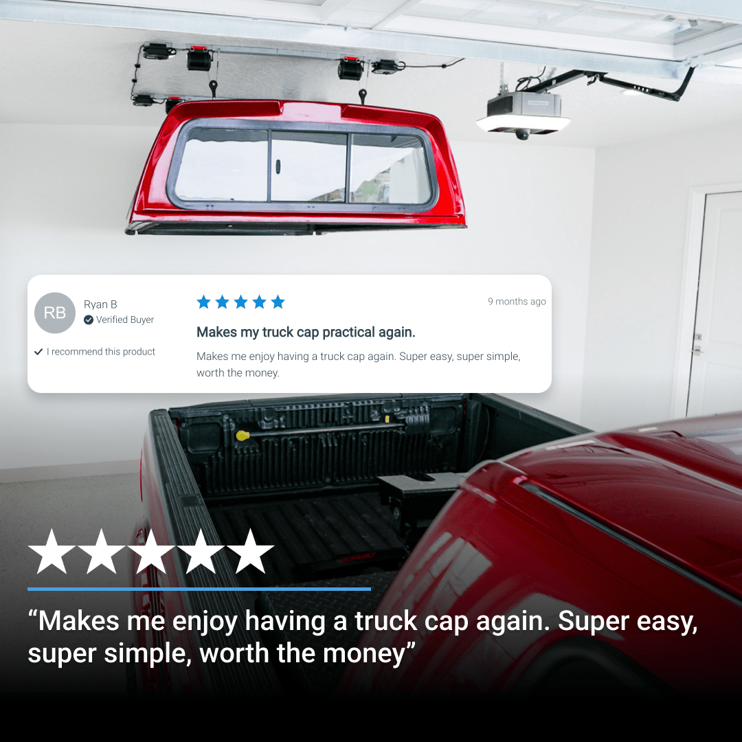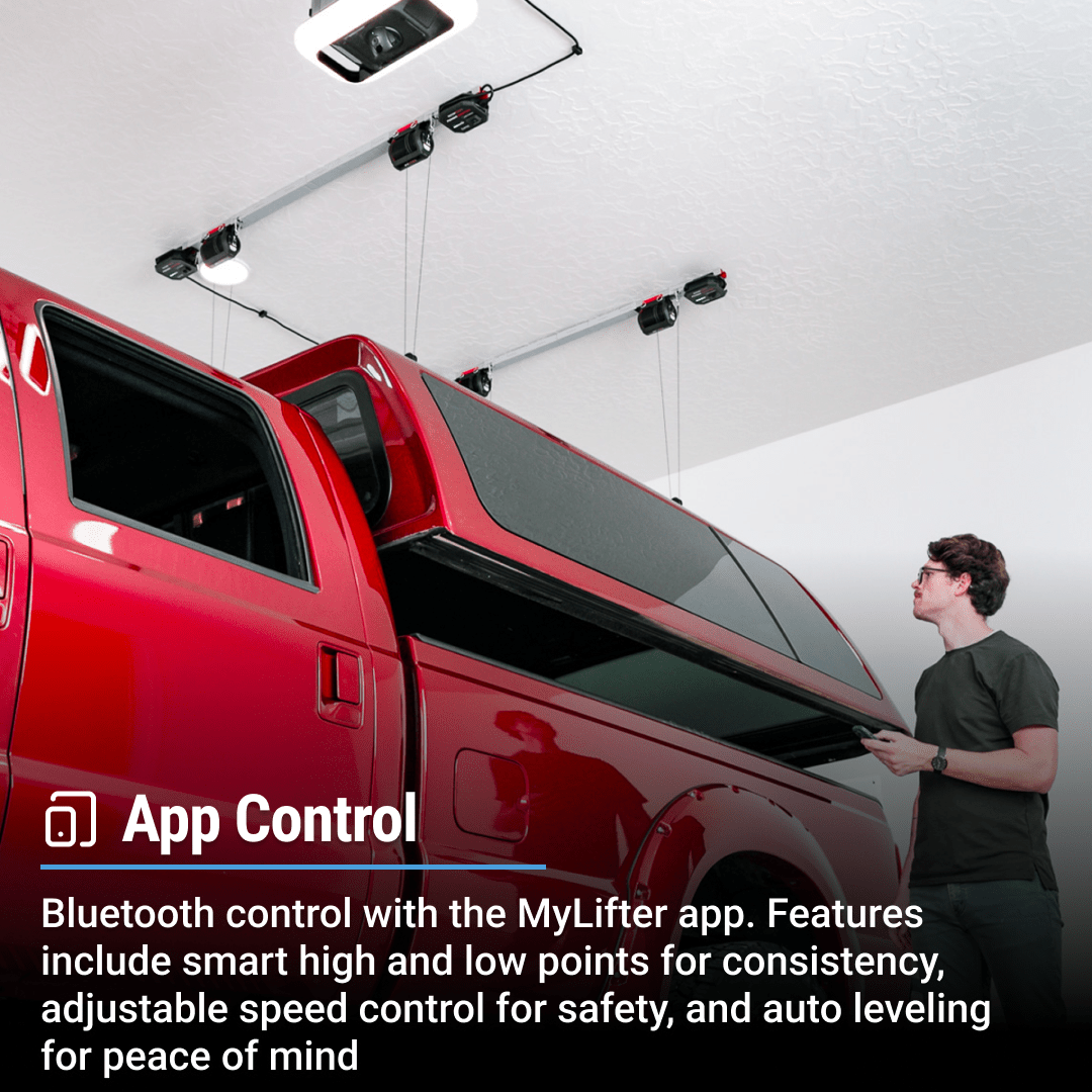 The MyLifter is the smartest and safest overhead storage motor. Period. With advanced features like weight sensing, overload protection, multi motor syncronization, Smart Stopping points, speed control, and a built in automatic lock, there really is nothing else like it. The Truck Top Lifter includes four MyLifter motors that work seamlessly together to hoist and store your Truck Shell.