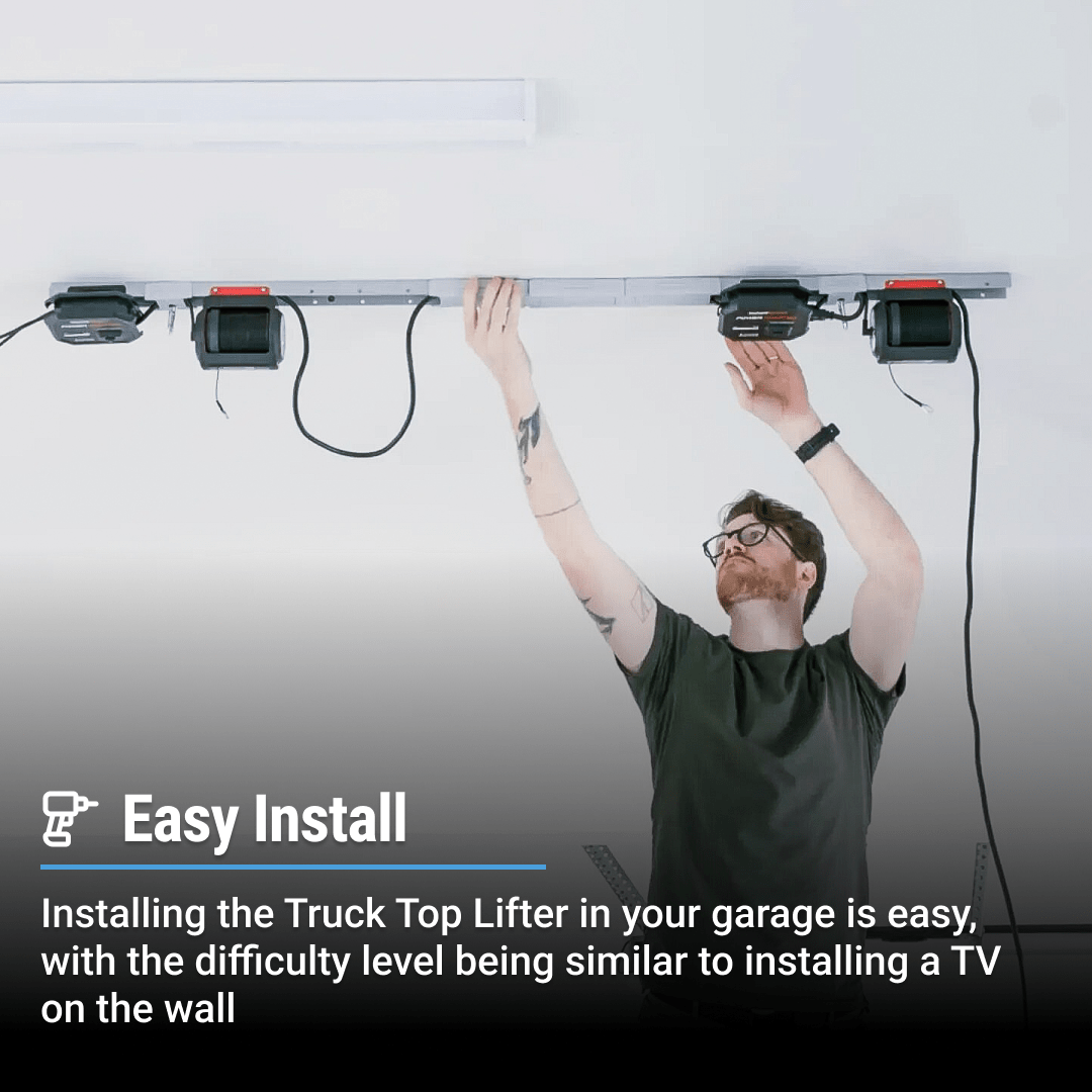 Installing the Truck Top Lifter in your garage is easy. The difficulty level is similar to assembling some boxed furniture and installing a TV on the wall.