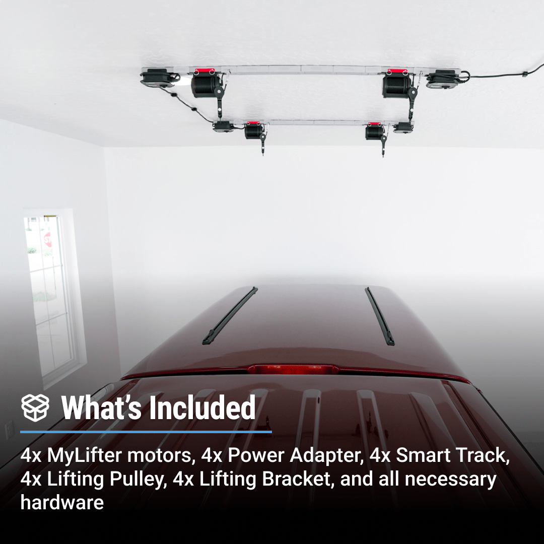 Rails Included Kit: 4x MyLifter, 4x Power Adapter, 4x DC Cables, 4x Smart Track with covers, 4X Lifting Brackets, 2x Cargo Rails, and Misc mounting hardware.