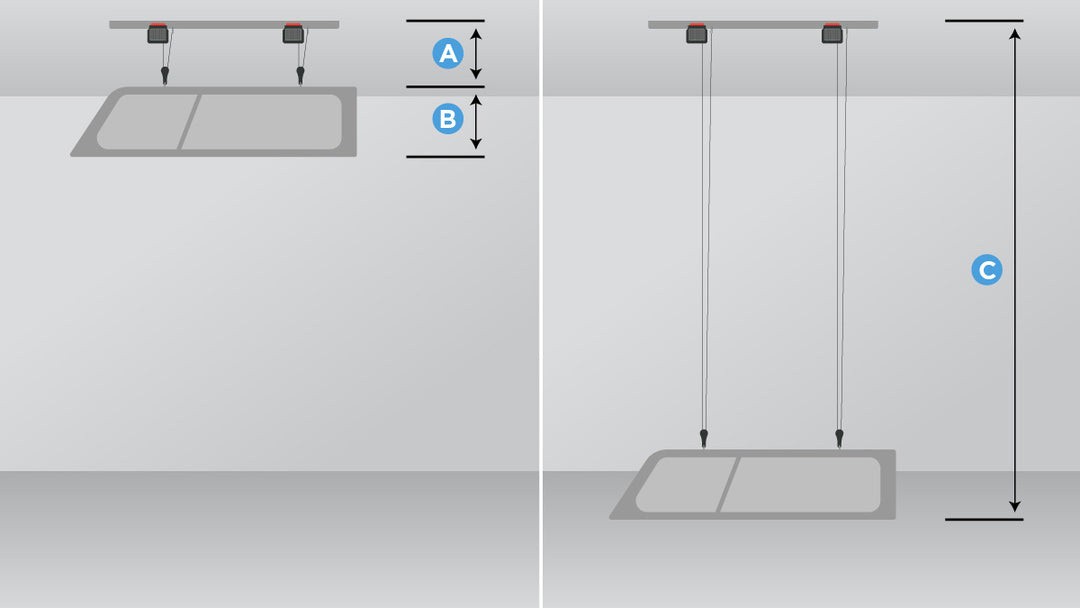 To ensure that your item will fit in the space desired, measure the overall height of the item you are going to hang (B). When the Truck Top Lifter has fully raised, the bottom of the frame hangs down 13 in from the ceiling (A). Take the height of your item and add it to 13 in to find the exact overhead clearance.