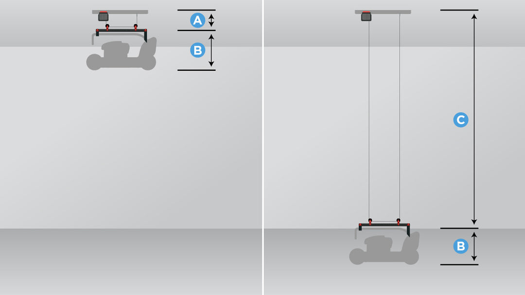 To ensure that your item will fit in the space desired, measure the overall height of the item you are going to hang (B). When the Universal Lifter has fully raised, the bottom of the frame hangs down 9.5in from the ceiling (A). Take the height of your item and add it to 9.5in to find the exact overhead clearance.