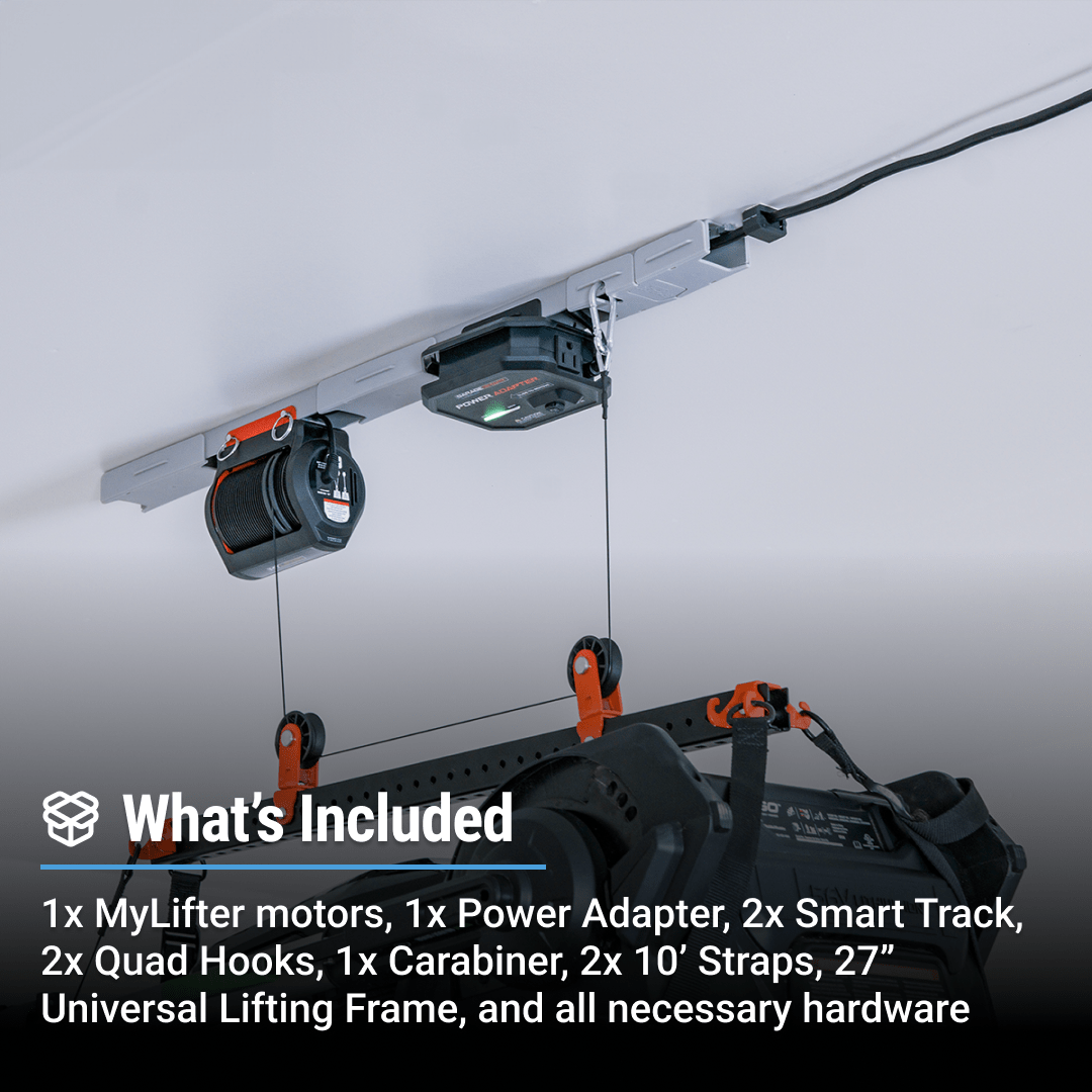 1x MyLifter, 1x Power Adapter, 1x 3' DC Cables, 2x Smart Track, Universal XL lifting frame and all needed mounting hardware.