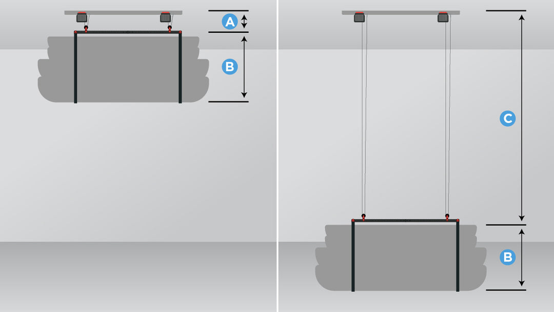 To ensure that your item will fit in the space desired, measure the overall height of the item you are going to hang (B). When the Universal Lifter has fully raised, the bottom of the frame hangs down 9.5in from the ceiling (A). Take the height of your item and add it to 9.5in to find the exact overhead clearance.
