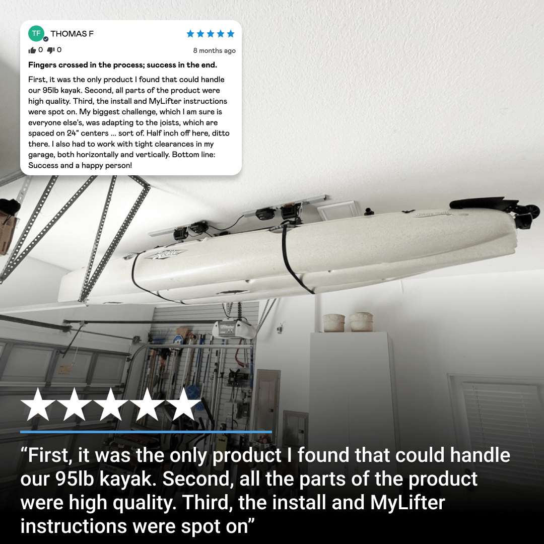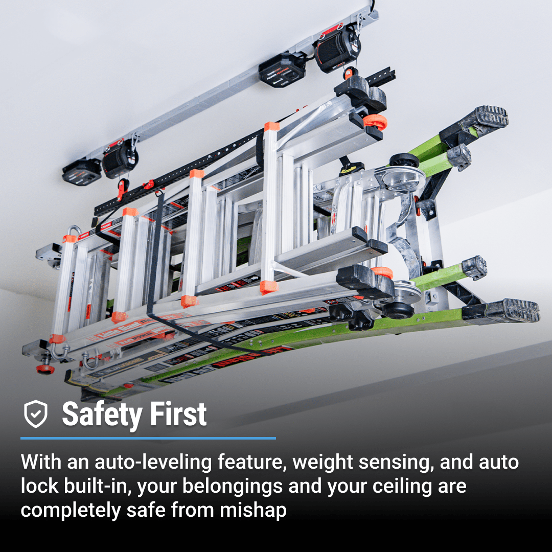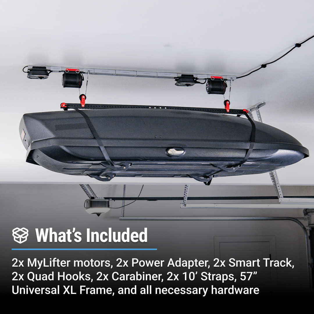The MyLifter is the smartest and safest overhead storage motor. Period. With advanced features like weight sensing, overload protection, multi motor syncronization, Smart Stopping points, speed control, and a built in automatic lock, there really is nothing else like it. The Universal XL HD Lifter includes two MyLifter motors that work seamlessly together to safely lift and store your items.