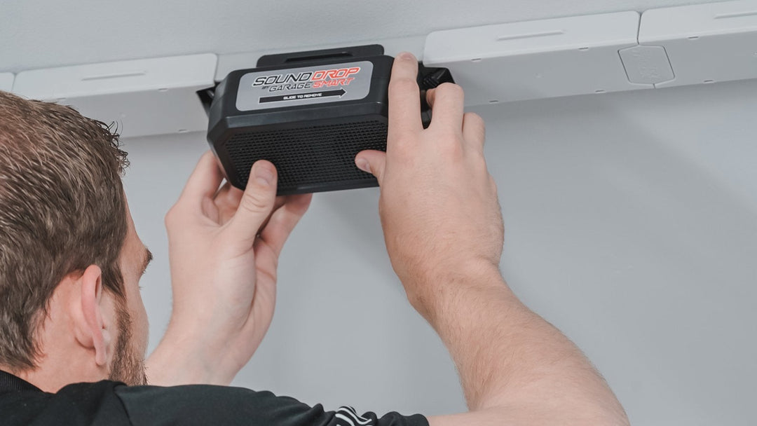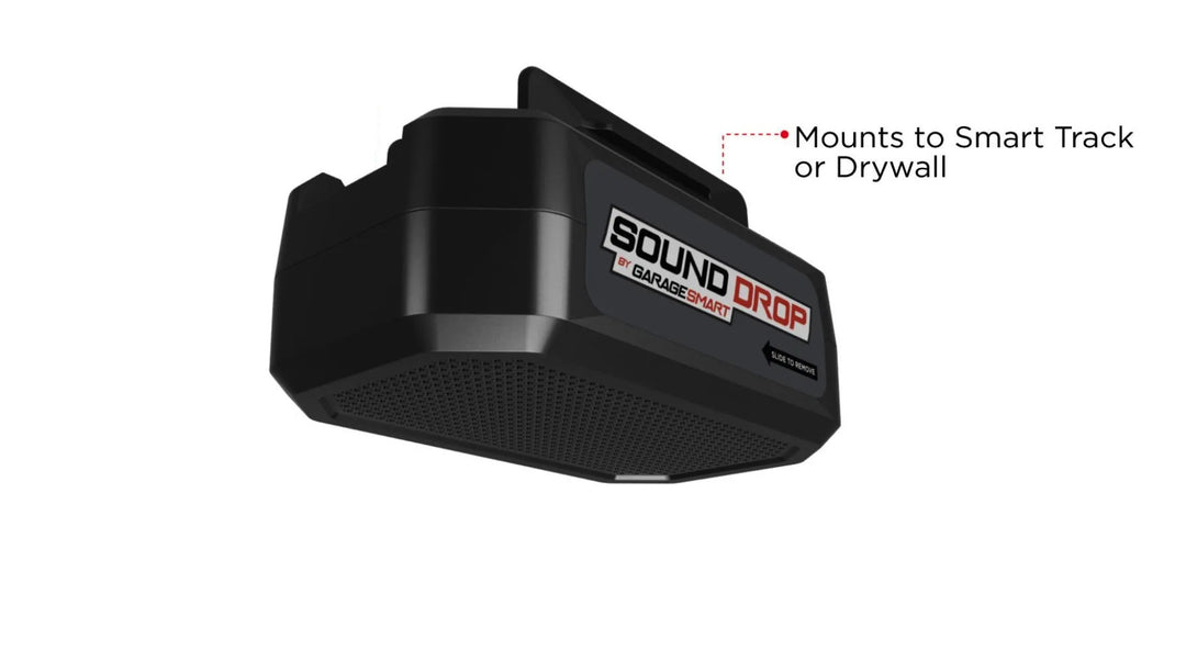 Installing the Sound Drop in your garage is quick easy. Use either the included mounting screws, or install it on some Smart Track you already have in place.