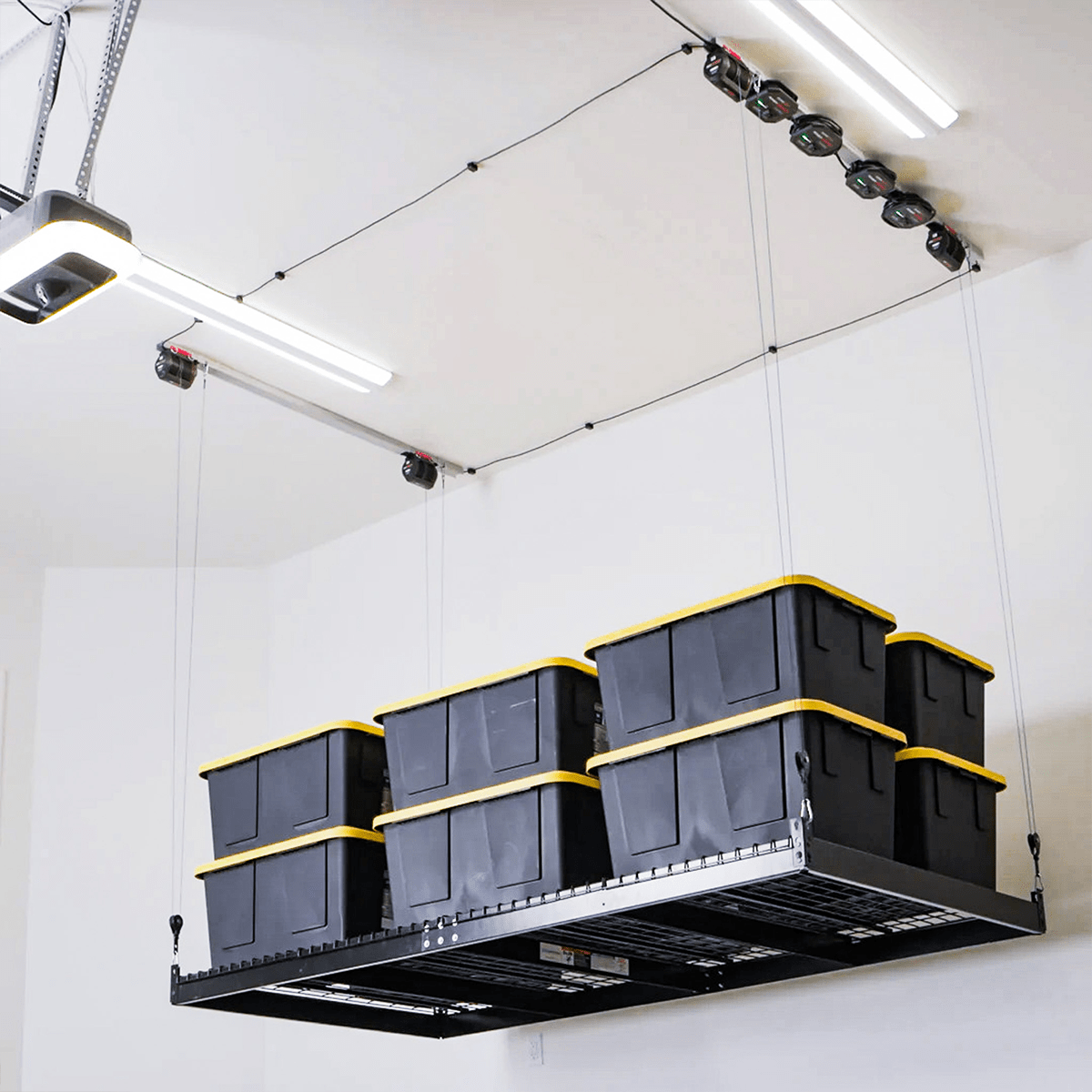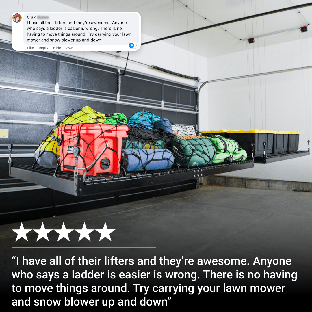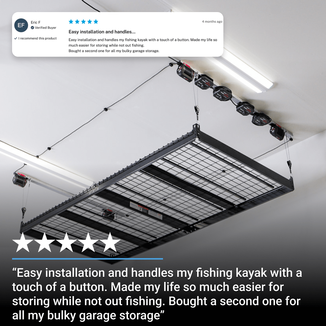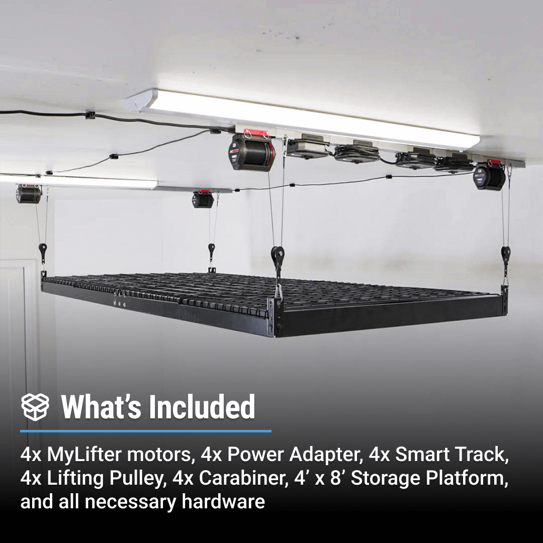 The MyLifter is the smartest and safest overhead storage motor. Period. With advanced features like weight sensing, overload protection, multi motor syncronization, Smart Stopping points, speed control, and a built in automatic lock, there really is nothing else like it. The Platform Lifter includes four MyLifter motors that work seamlessly together to safely lift and store your items.