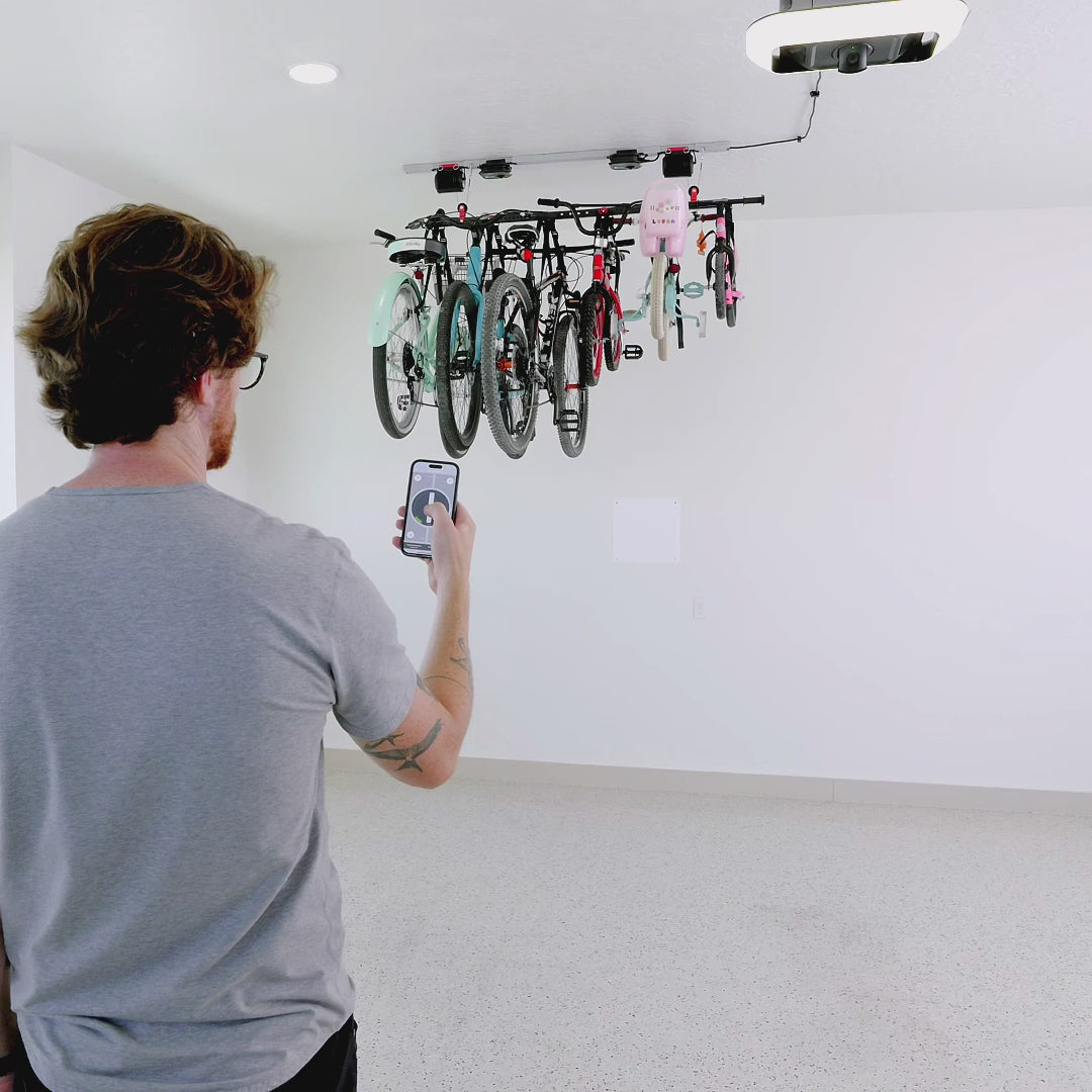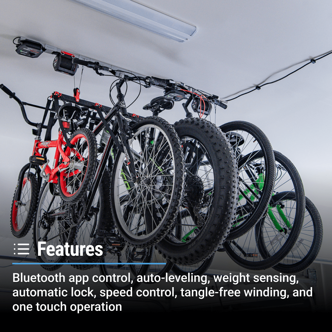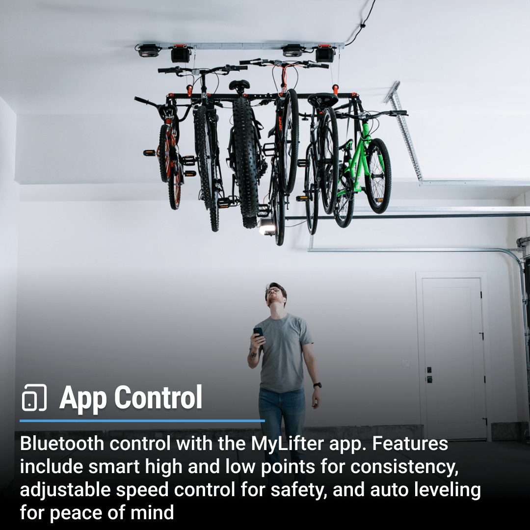 The MyLifter is the smartest and safest overhead storage motor. Period. With advanced features like weight sensing, overload protection, multi motor syncronization, Smart Stopping points, speed control, and a built in automatic lock, there really is nothing else like it. The Multi-Bike XL includes two MyLifter motors that work seamlessly together to safely lift and store your bikes.
