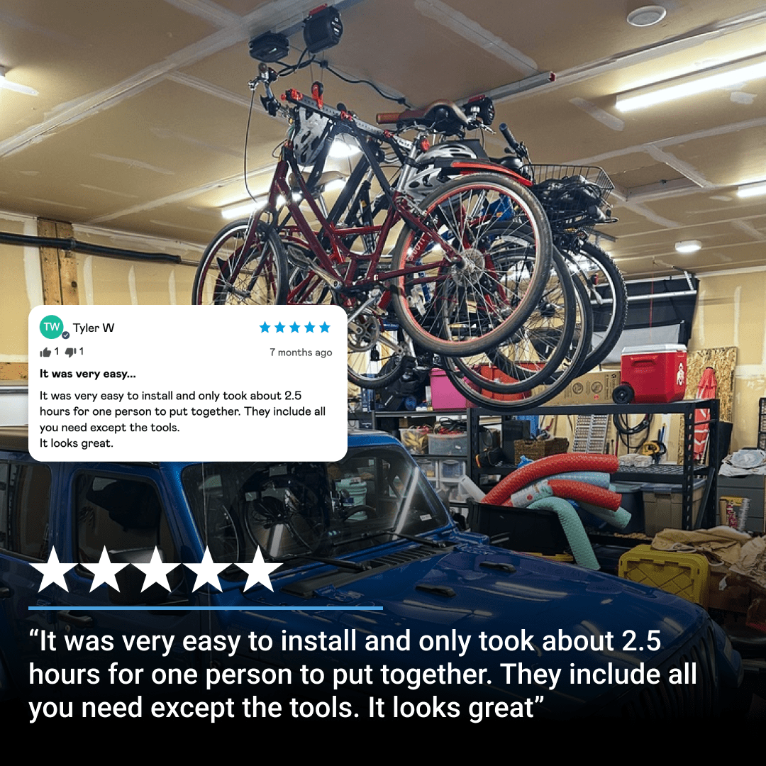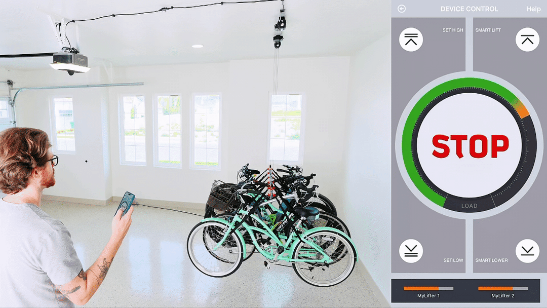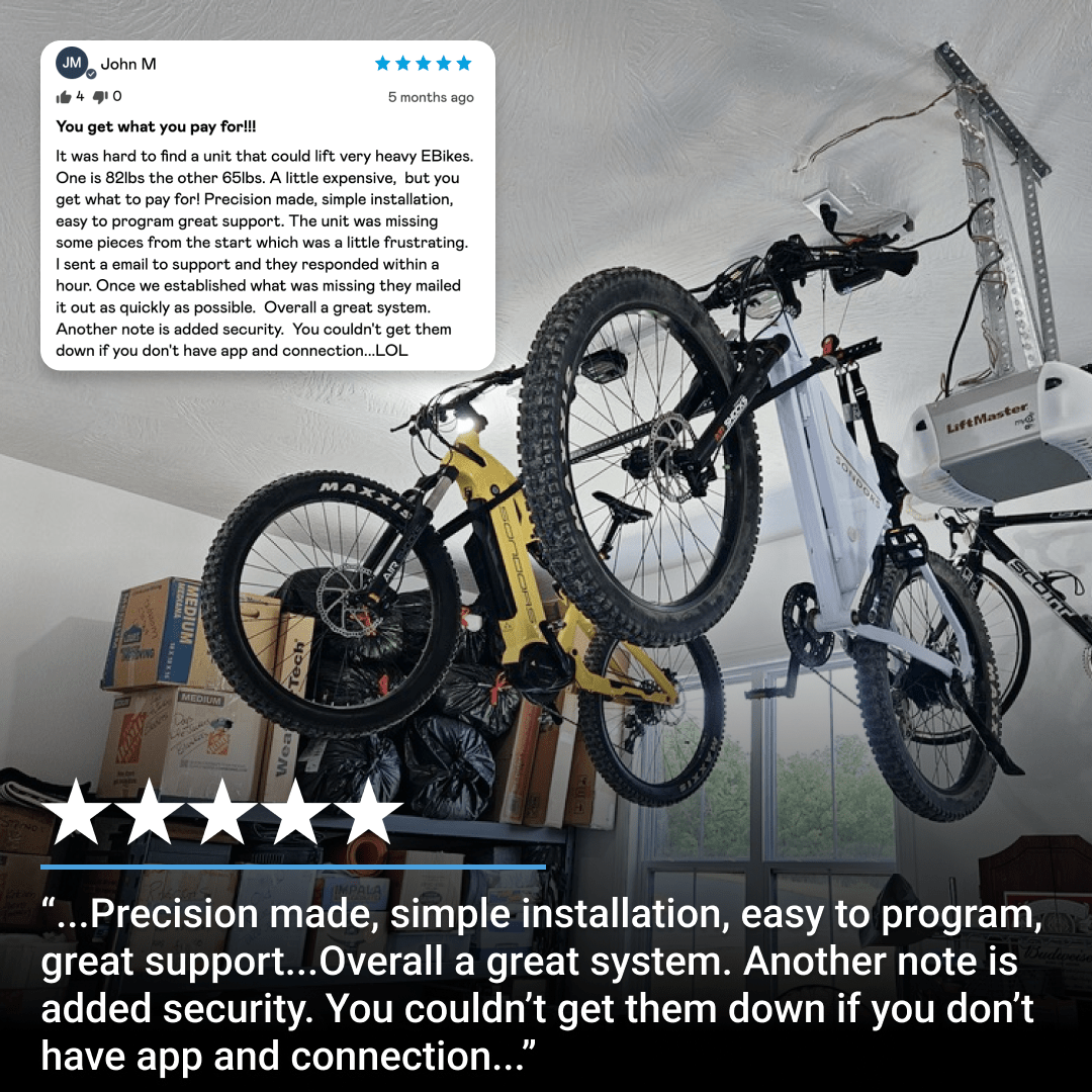 The MyLifter is the smartest and safest overhead storage motor. Period. With advanced features like weight sensing, overload protection, multi motor syncronization, Smart Stopping points, speed control, and a built in automatic lock, there really is nothing else like it. The Multi-Bike XL includes two MyLifter motors that work seamlessly together to safely lift and store your bikes.