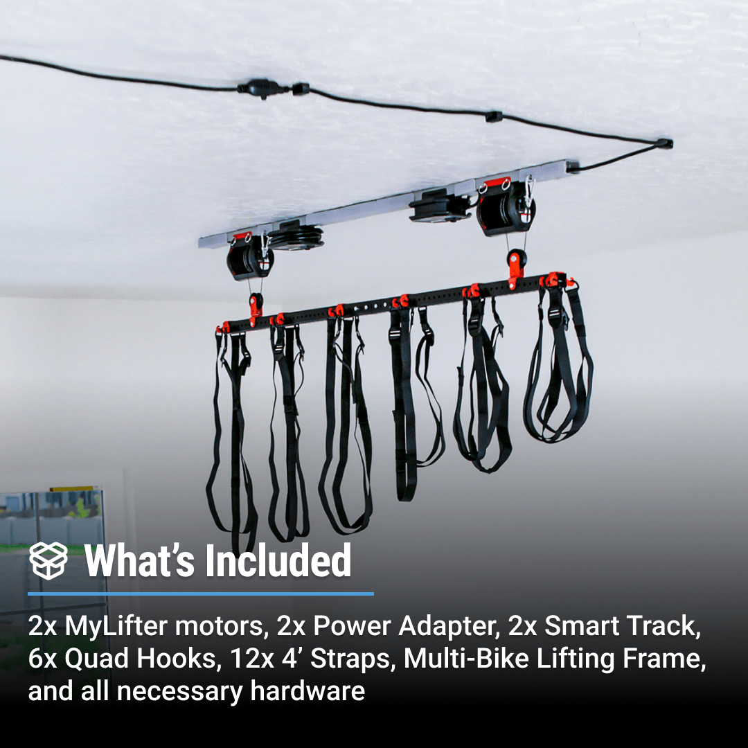 2x MyLifter, 2x Power Adapter, 2x 3' DC Cables, 2x Smart Track, Multi-Bike XL lifting frame, 6x Quad Hooks, 12x 4' Adjustable straps and all needed mounting hardware.