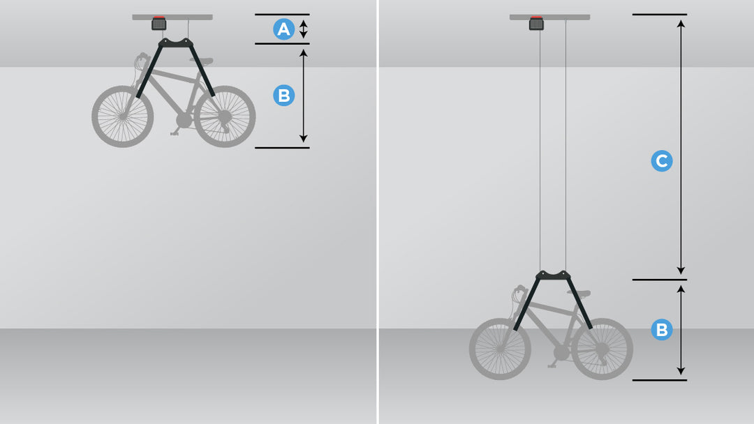 To ensure that your bikes will fit in the space desired, measure the height of your bikes (B). Take the height of your tallest bike and add 9.5in (A) to find the exact overhead clearance.